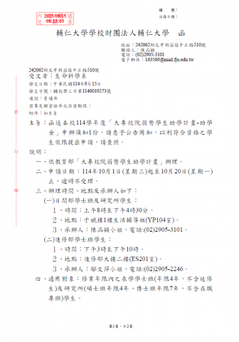函送本校114學年度「大專校院弱勢學生助學計畫-助學金」申辦須知1份,請惠予公告周知,以利符合資格之學生依限提出申請,請查照。.pdf