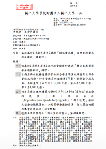 請獲獎同學於114年11月14日(星期五)前至學務處獎(助)學金系統:(http://stuservice.fju.edu.tw/fjcugrant/)
