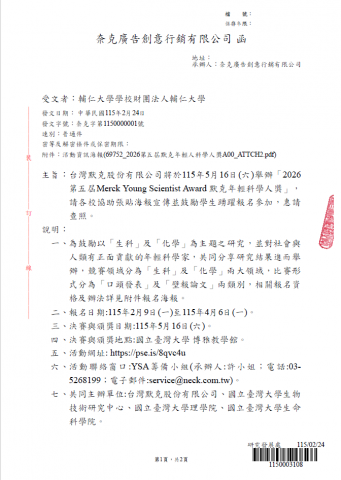 【活動訊息】「2026 第五屆Merck Young Scientist Award 默克年輕科學人獎」鼓勵踴躍參加 附件: 69752_2026第五屆默克年輕人科學人獎A00_ATTCH2.pdf 台灣默克股份有限公司將於115年5月16日(六)舉辦「2026 第五屆Merck Young Scientist Award 默克年輕科學人獎」,請各校協助張貼海報宣傳並鼓勵學生踴躍報名參加,惠請 查照。.pdf