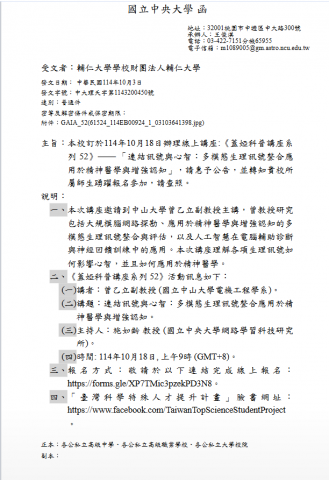 【活動訊息】國立中央大學10月18日辦理線上講座:《蓋婭科普講座系列 52》
