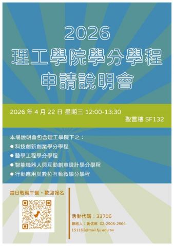 115學年度理工學院學分學程說明會將在4月22日中午於聖言樓SF132舉辦,活動海報請見附加檔。