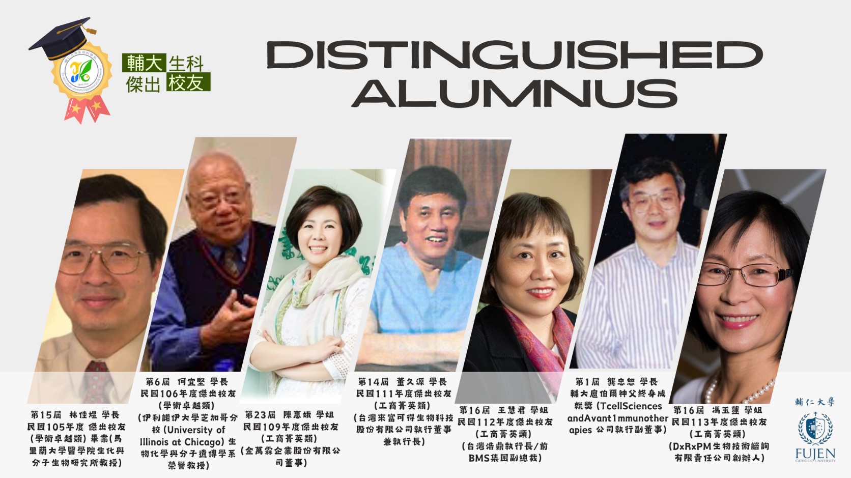 生物系第一屆系友張惠平教授畢業後,赴美南伊利諾大學攻讀微生物學博士,爾後於美國國家衛生研究院作博士後研究,並成為喬治城大學朗巴第癌症中心教授,同時亦為史丹福大學醫學中心教授。其於癌症之基因療法研究成果,1999年初被美國癌症研究協會評選為最傑出論文。88學年度張教授亦被選為「輔仁大學傑出校友」。