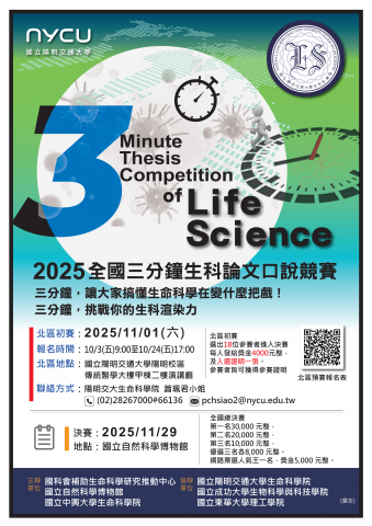 本校生命科學院將於114年11月1日舉行「2025年全國三分鐘生科論文口說競賽-北區預賽」,敬請惠予公告並鼓勵貴校生科領域學生踴躍報名參加。.pdf