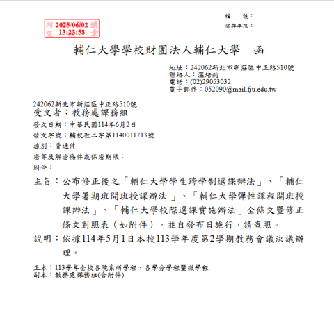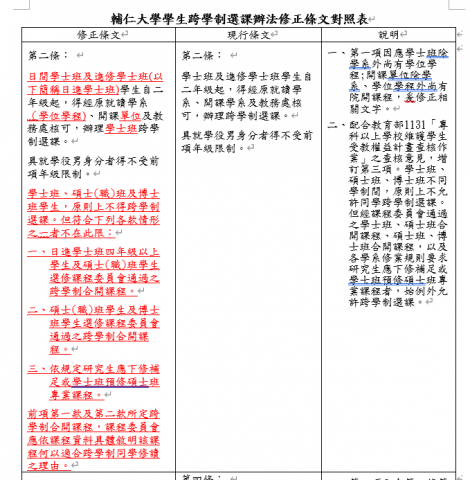 附件: 114-1選課須知彙整版-定稿-114.5.28.doc 輔仁大學彈性課程開班授課辦法-1132修正第10、14條對照表及修正後全條文-1140501教務會議通過.pdf 輔仁大學暑期班開班授課辦法-1132修正第6、12、17條修正對照表及修正後全條文-1140501教務會議通過.pdf 輔仁大學學生跨學制選課辦法-1132修正第2、4條對照表及修正後全條文-1140501教務會議通過.pdf 輔仁大學校際選課實施辦法-1132修正第14條對照表及修正後全條文-1140501教務會議通過.pdf