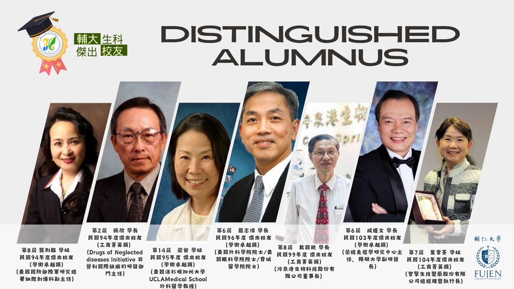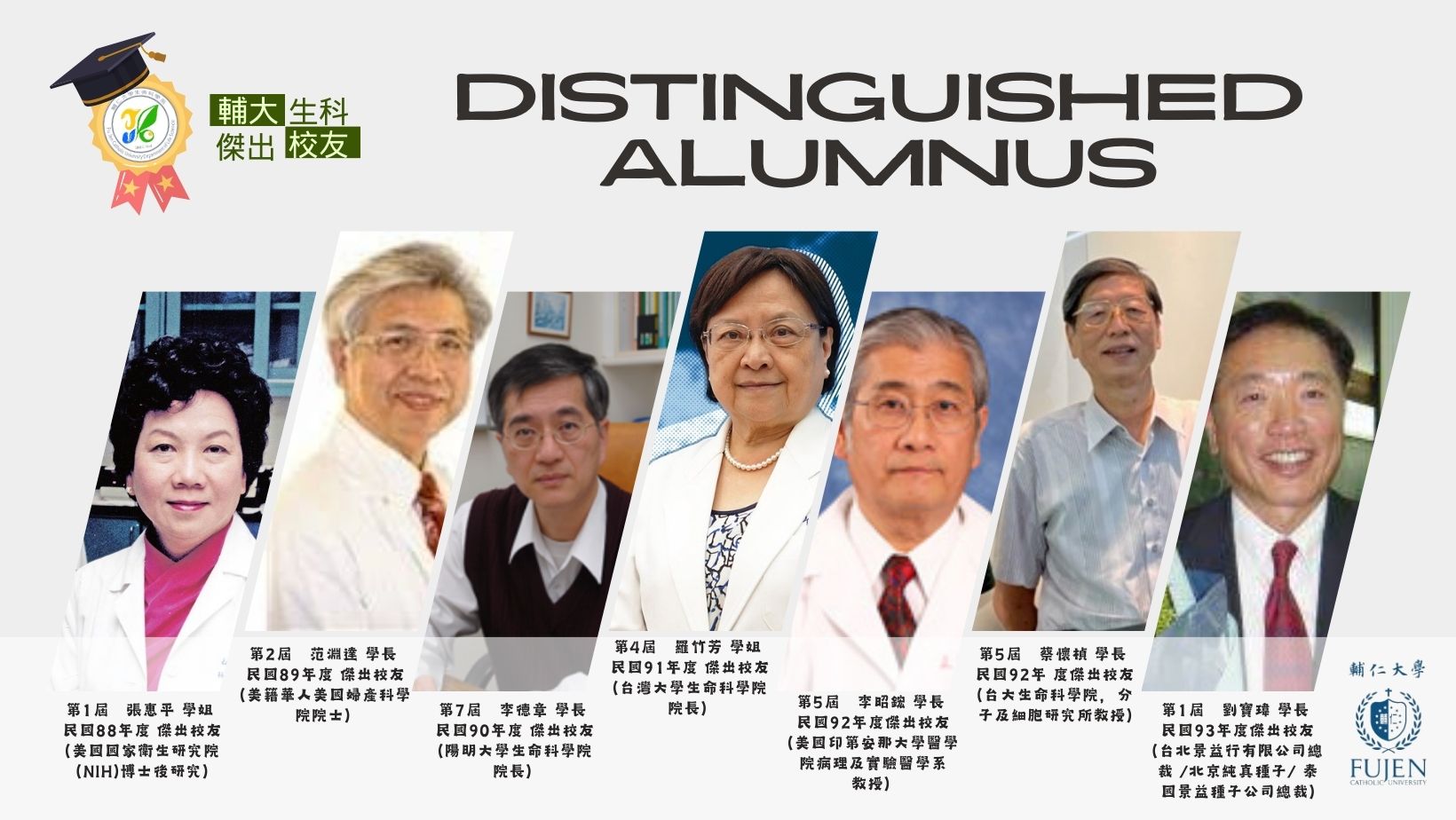 生物系第一屆系友張惠平教授畢業後,赴美南伊利諾大學攻讀微生物學博士,爾後於美國國家衛生研究院作博士後研究,並成為喬治城大學朗巴第癌症中心教授,同時亦為史丹福大學醫學中心教授。其於癌症之基因療法研究成果,1999年初被美國癌症研究協會評選為最傑出論文。88學年度張教授亦被選為「輔仁大學傑出校友」。