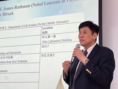 Prof. Rothman現任美國耶魯大學細胞生物學講座教授(Sterling Professor of Cell Biology),同時也是奈米生物學研究所的創辦人與主任。在與系上教師的座談中,Prof. Rothman也針對當前熱門的「胞外囊泡」(Extracellular Vesicles, Exosomes)分享了他的觀點與研究。他指出了胞外囊泡在醫學上的巨大潛力,尤其是在癌症治療方面。他認為,當前迫切需要的是開發合成的胞外囊泡(synthetic exosome),例如利用單一或兩種重組蛋白(如CD9)和脂質奈米顆粒作為基礎,來封存 microRNA 或其他有效成分。他表示,這項基礎核心知識與智慧財產權的開發,將推動該領域的重大進展。系上教師們藉此機會與諾貝爾獎得主近距離交流,對未來研究方向獲益良多。