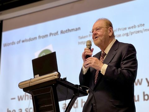 Prof. Rothman 伉儷於座談會後亦特別撥冗在新理工大樓一樓郝思漢講堂與生命科學系的學生們進行了簡短的談話。此會談在系上周秀慧老師精心製做的Prof. Rothman介紹及引言後開始,Prof. Rothman分享了自己的學術歷程。他坦言自己從小就想成為科學家,最初對物理學抱有興趣,直到在耶魯大學畢業前才接觸生物學。他強調,當初在分子生物學的邏輯與底層之美尚未完全顯現時,他選擇接受了廣泛的教育(包括數學、物理學、人類健康、疾病、生物化學,乃至於現在的腦神經科學)。
