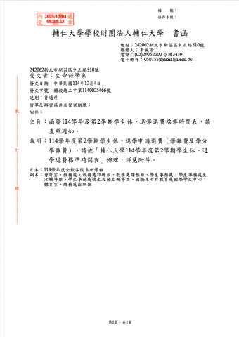 【校公告】函發114學年度第2學期學生休、退學退費標準時間表事宜