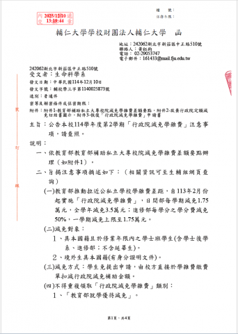 公告本校114學年度第2學期「行政院減免學雜費」注意事項,請查照。.pdf
