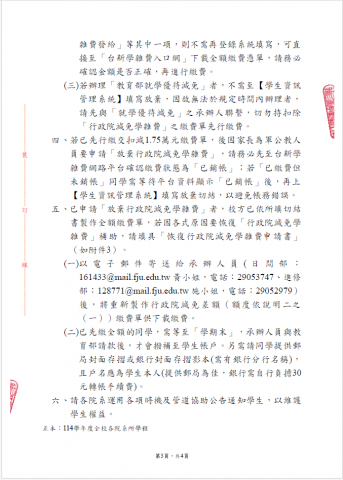 【校公告】本校114學年度第2學期「行政院減免學雜費」注意事項
