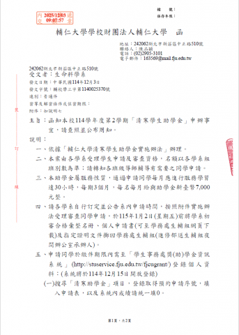 《若有意申請同學,請於12月20日前將資料交至系辦》 附件: 01.輔仁大學清寒學生助學金實施辦法 (3).pdf 02.清寒學生助學金彙整名冊.pdf 03.清寒學生助學金申請書新版.pdf 04.清寒助學金請款名冊.pdf 114學年度第2學期「清寒學生助學金」申辦事宜,請查照並公布周知。.pdf