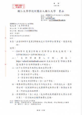 【校公告】114學年度第二學期繳交日間部學分費事宜