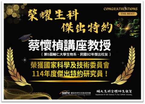 恭喜輔仁大學生命科學系、信望愛講座教授蔡懷楨,榮獲國家科學及技術委員會(NSTC)114年度「傑出特約研究員」! 蔡老師深耕基因轉殖與新藥開發,學術研究與產學應用雙軌並進,樹立頂尖學者典範。 「特約研究員」是國科會針對長期執行研究計畫且**曾獲累計兩次以上「傑出研究獎」**之學者所設立的極高榮譽。蔡教授此次獲獎,不僅是對其老師在學術界崇高地位的肯定,更是輔仁大學生科系在生醫研發能量上的重大里程碑。 再次恭喜蔡懷楨教授!老師的卓越成就,是輔仁大學生命科學系全體師生共同的驕傲!