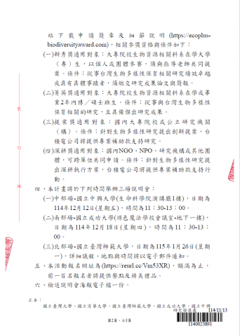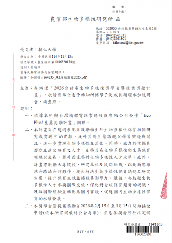 為辦理「2026台積電生物多樣性獎學金暨提案獎勵計畫」,敬請貴單位惠予轉知所轄學子及成員踴躍參加說明會,請查照。.pdf