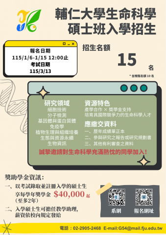 輔仁大學生命科學系_115學年度碩士班入學招生已開始招生~ * 相關資訊以本校教務處招生組公告為主* 報名網址: 輔仁大學招生資訊平台考生專區 (fju.edu.tw)報名時間:自115年1月06日至1月15日12:00止 簡章:https://reurl.cc/W8A9ZZ 誠摯歡迎您加入~ 附件: 115碩士班招生簡章.pdf